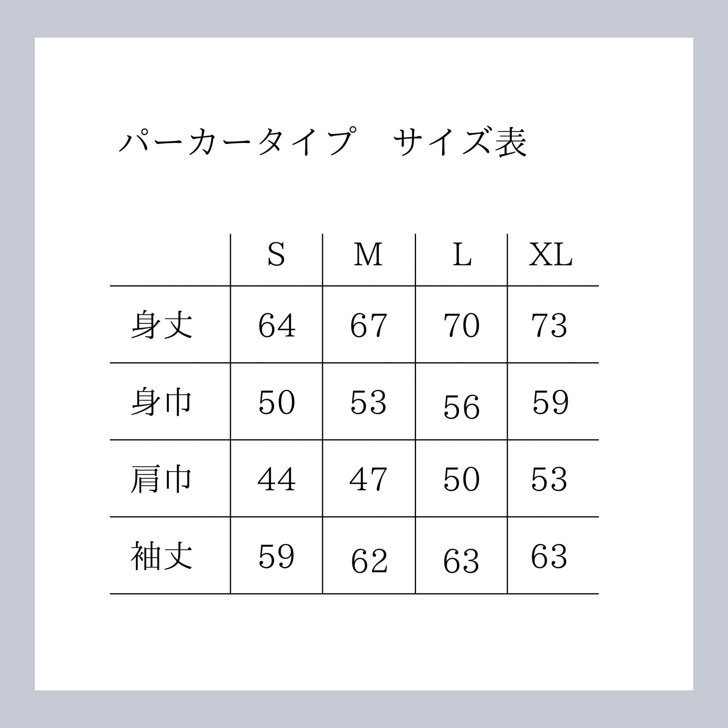 パーカー、スウェットでそれぞれサイズが異なりますので、サイズ表をご覧の上ご購入をお願いします。