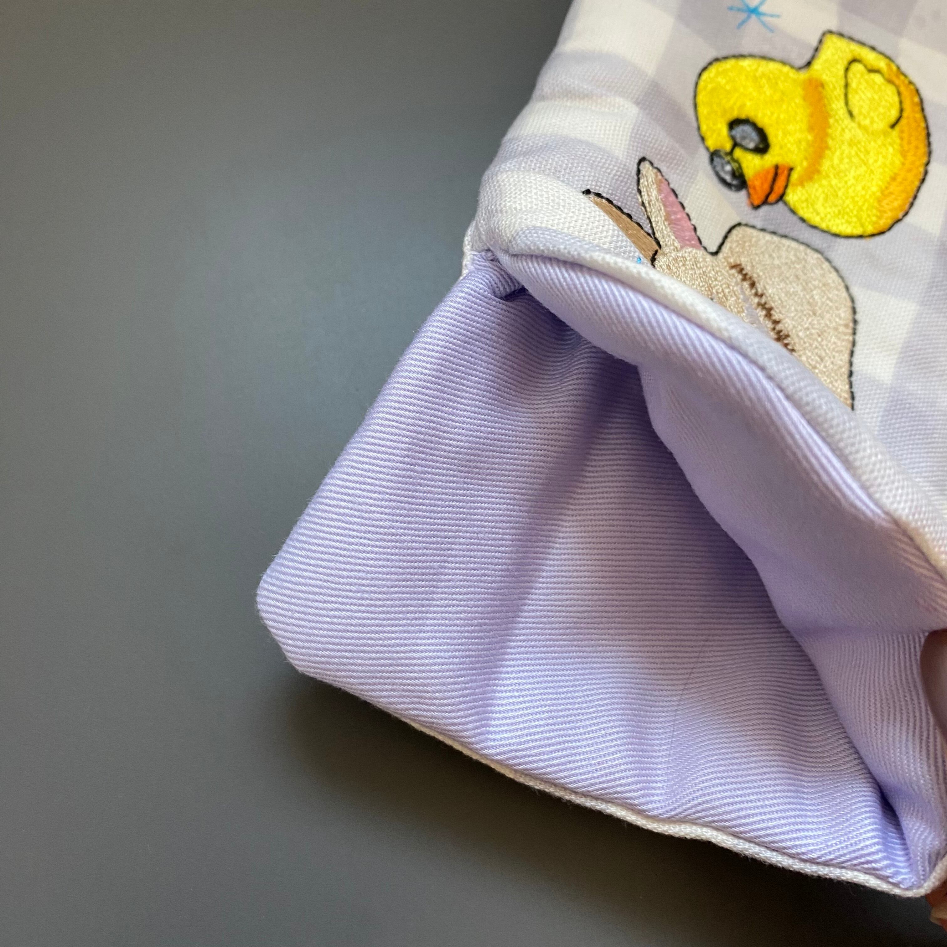 刺繍は、ネザーランドドワーフと、お風呂でお馴染みのひよこのデザインです。