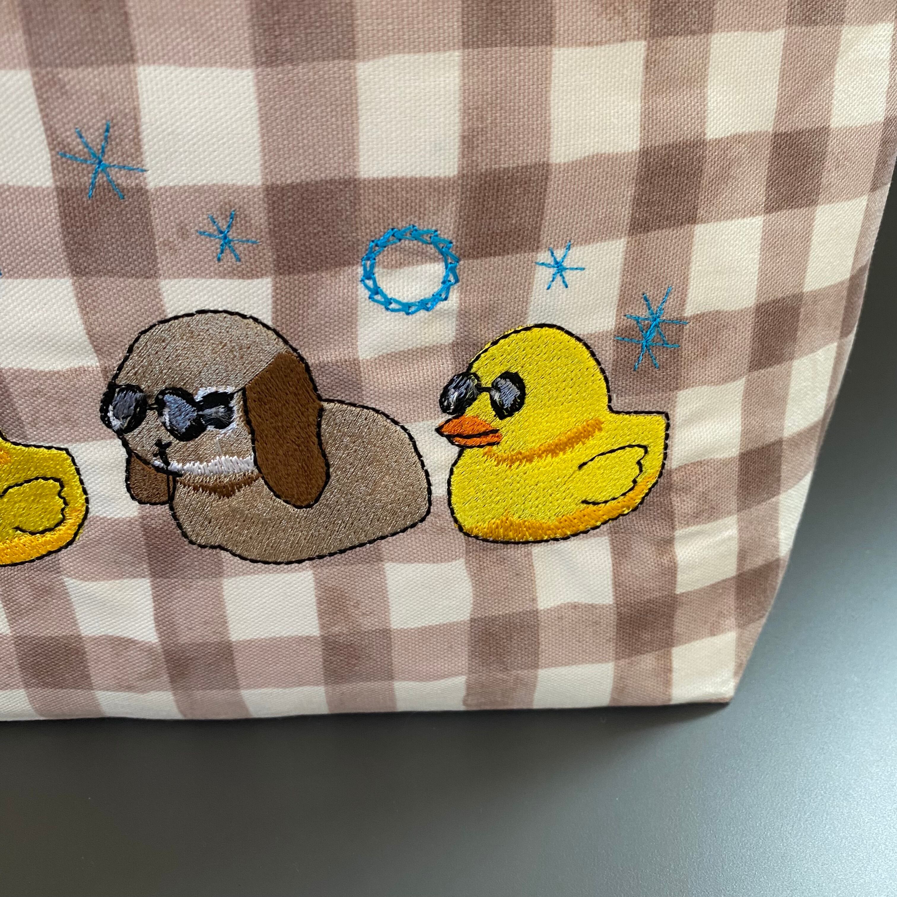 チェック柄のトートバッグに、サングラスをかけたひよことうさぎの刺繍を合わせました。
